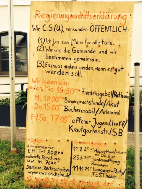 In der diesjährigen Freinacht platzierten einige Erkheimer Bürger eine "Regierungsantrittserklärung" vor dem Rathaus. Wir von der CWV haben uns über die Anregungen sehr gefreut und werden versuchen die genannten Termine auch bestmöglich zu realisieren. Es ist ja immerhin der Wunsch dieser Erkheimer Bürger ;-)